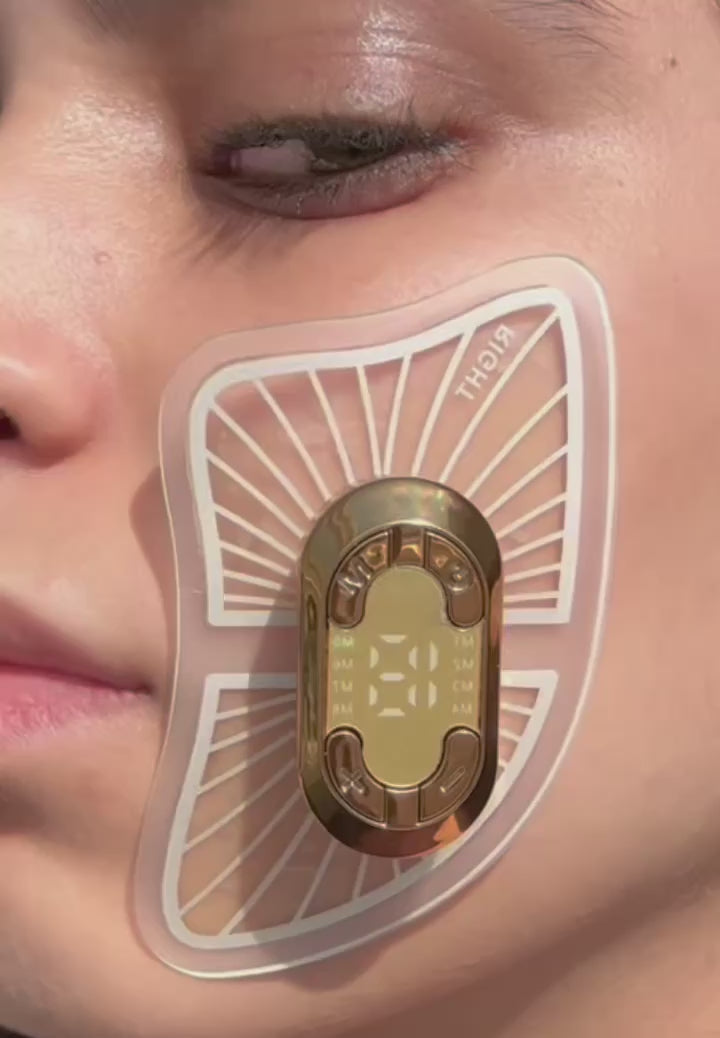 Our device delivers targeted EMS pulses through hydrogel patches, stimulating the underlying facial muscles the key drivers of skin aging.